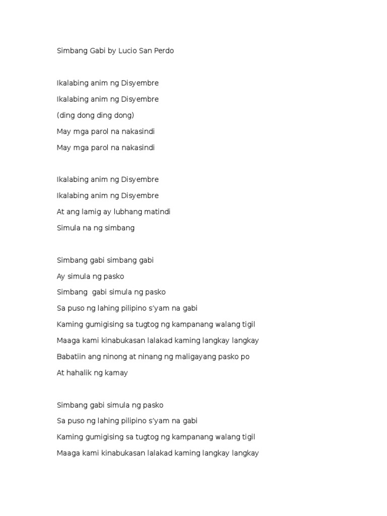 Ikalabing anim ng Disyembre Ikalabing anim ng Disyembre At ang lamig ay lubhang matindi Simula na ng simbang Simbang gabi simbang gabi Ay simula ng pasko Simbang gabi simula ng pasko Sa puso ng lahing pilipino syam na gabi Kaming gumigising sa tugtog ng kampanang walang tigil Maaga kami kinabukasan lalakad kaming langkay langkay Babatiin.
