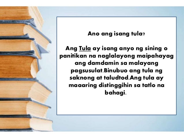Ano ang isang tula. Kahulugan ng Tula at Elemento nio 1. Ang Tula ay isang anyo ng sining o panitikan na naglalayong maipahayag ang damdamin sa malayang pagsusulatBinubuo ang tula ng saknong at taludtodAng tula ay maaaring distinggihin sa tatlo na bahagi.